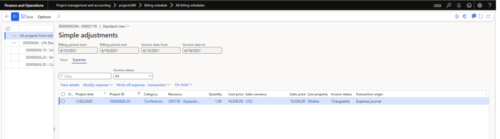 Go to Project management and accounting > projects360 > Billing schedule > Billing schedule by approver > Process > Simple adjustments