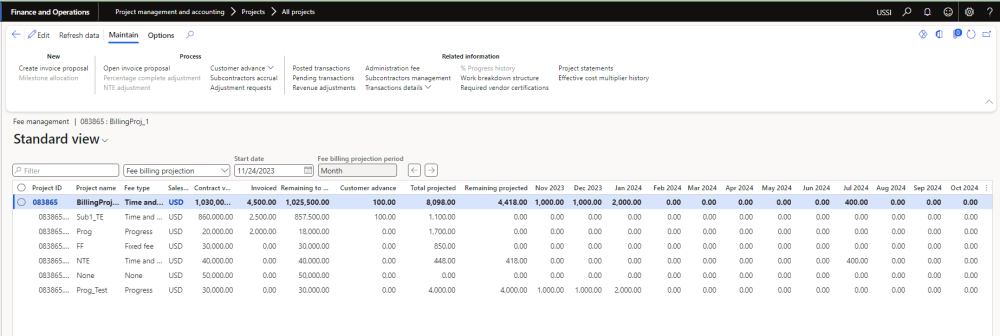 New functionality has been introduced to allows users to forecast project billing. User is provided with a new Fee management form view where total projected and remaining projected will be calculated based on entered projected billing amount.