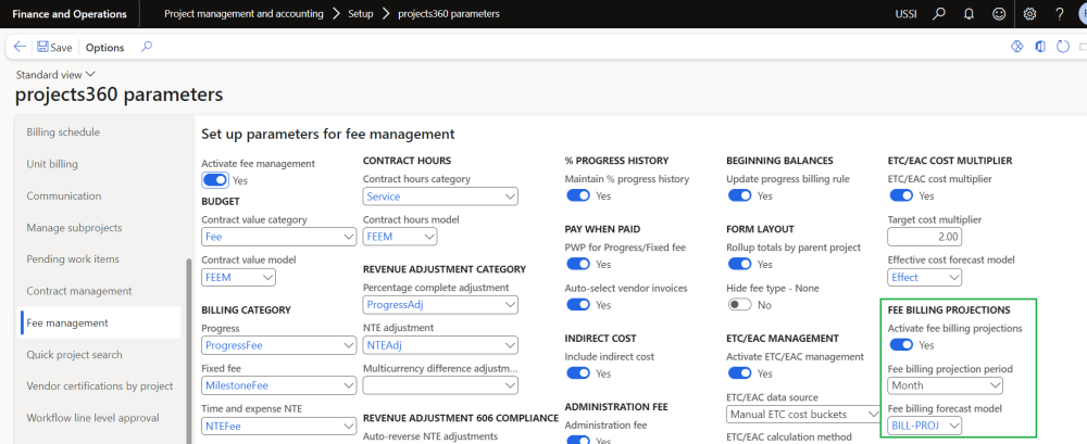 | Activate fee billing projections | This parameter enables users to activate fee billing projections functionality. |