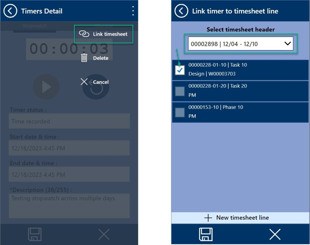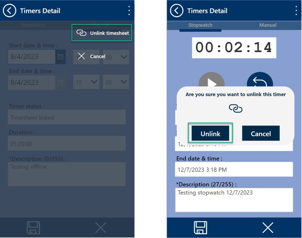 - However, the option ‘Unlink timer’ will be available from the timesheet line while the related timesheet header is still in “Draft” or “Returned” status.