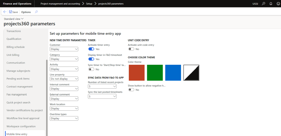 In the Finance and Operations module, the introduction of the Mobile Time Entry tab within the Projects360 parameter form consolidates all parameters related to the timesheet app. These parameters directly impact the functionality available on the app. This section provides a detailed definition of each parameter on the form. Subsequent sections provide further details on how these parameters specifically influence the app’s functionality.