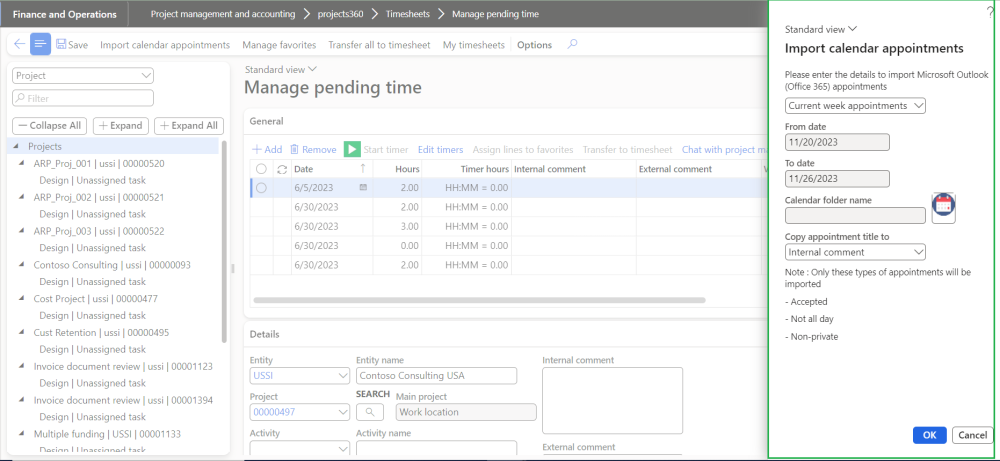 Once the user hits the ‘Import calendar appointments’, a new form opens up to facilitate this process. On this new form users have to select\define period and calendar for which the data needs to imported. For period selection, current week, previous week and date range options are available. Once the user selects current or previous week option, From date and To dates are auto filled based on the system date. For date range option, user has to enter in the dates. User can copy the appointment title on the manage pending time and option is provide to copy to Internal comment field, External comment field or into both fields.
