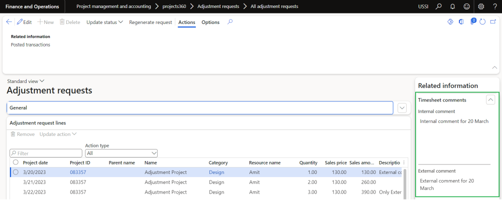 In this enhancement, we have introduced fact box to display timesheet Internal/External comments for hour transactions on Adjustment requests form.
