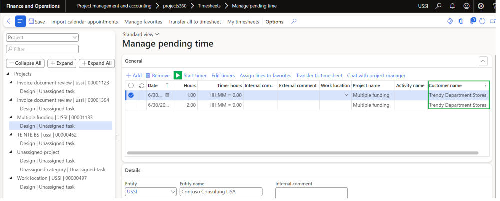 In this enhancement, the customer name is displayed on the manage pending time form from the project when the project contract involves multiple funding sources. This feature is enabled by the parameter “Show for multiple funding source,” allowing users to have greater visibility and clarity regarding the customer associated with each transaction.