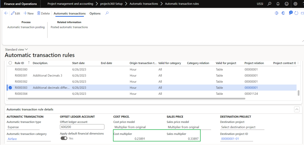 In this enhancement, the number of decimals for “Cost multiplier” and “Sales multiplier” in Automatic transactions has been increased to five. This update allows for greater flexibility in calculating cost and sales multipliers for automatic transactions. By increasing the number of decimals to five, users can now input more precise values for these multipliers, accommodating scenarios that require a higher level of accuracy.