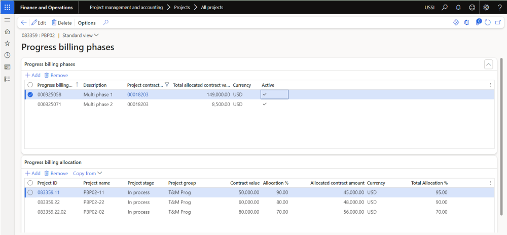 Users can define progress billing phases at the project contract level, allowing for precise allocation of progress percentages throughout the project or subproject duration. By configuring these phases, users can accurately track and reflect the progress made on a project, resulting in the generation of invoices that align with the project’s advancement.