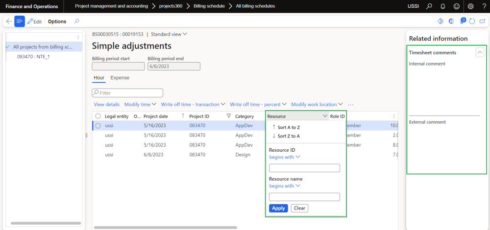 In this enhancement, “Resource” and “Role Id” fields have been made filtrable on the “Simple adjustments” form opened from billing schedule form. This improvement allows users to filter transactions based on resource and perform adjustments more efficiently. It simplifies the process of performing adjustments by narrowing down the transactions to those directly relevant to the selected resource or role.