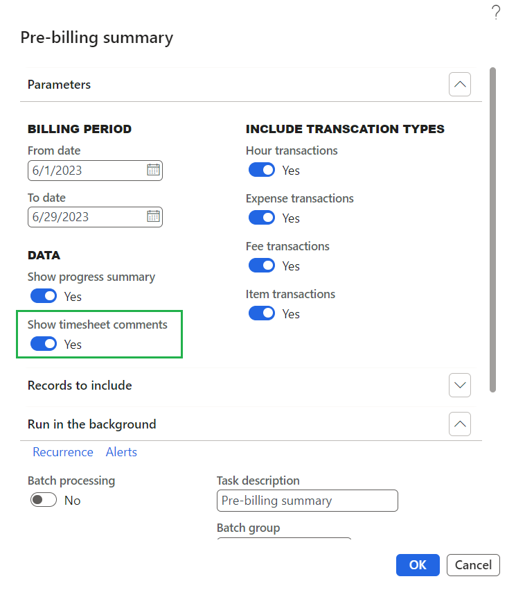 In this enhancement, a new parameter “Show timesheet comments” has been introduced for the prebilling summary report, which determines whether timesheet Internal/External comments for hour transactions are to be displayed. This parameter allows users to customize the visibility of the comments in the prebilling summary report based on their preferences or specific reporting requirements.