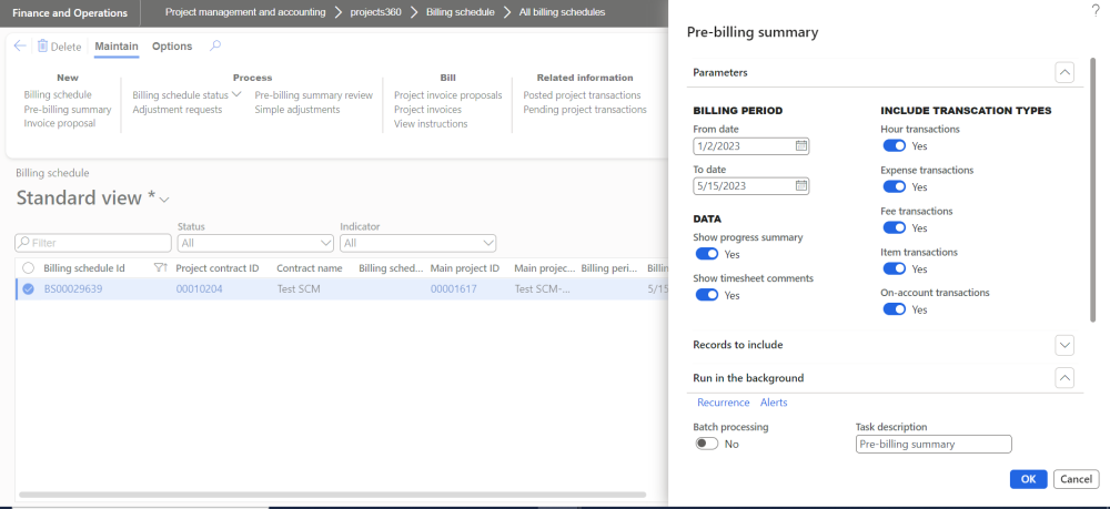 On projects360 parameter form, under billing schedule tab, a new parameter “Activate pre-billing summary” has been introduced to control the pre-billing summary functionality. When this checkbox is turned on ‘Yes’, the Pre-billing summary feature is activated.
