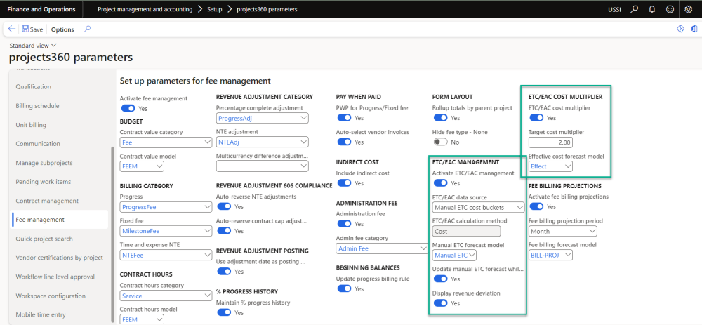 Go to Project management and accounting > All projects > Project contracts > Fee management tab > ETC/EAC management settings