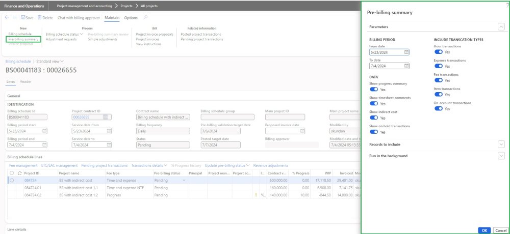 Go to Project management and accounting > Projects > All projects > Billing schedule tab > Billing schedule button > Select Billing schedule ID.
