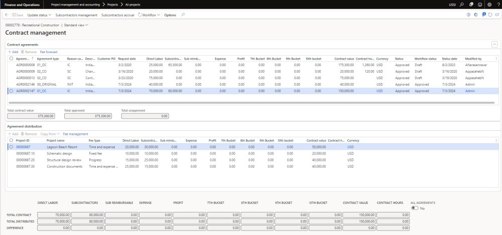 This grid allows to create new agreements and change orders. Once the agreements are approved, contract values and contract hours are updated to fee management form as the project contract values and hours. Simultaneously upon the approval, fee forecasts are also created for the agreement lines, but the base for fee forecasts will agreement distributions. User cannot reject contract agreement if there are open invoice proposals linked to the contract ID. This restriction will prevent any updates to the agreement until the open invoice proposal is either posted or deleted.
