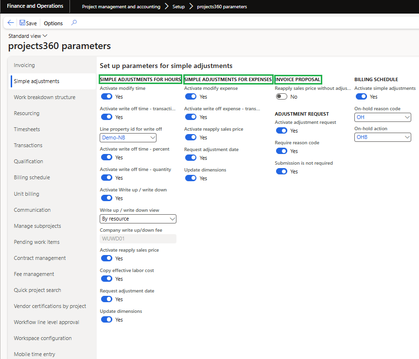 On projects360 parameter form, under Simple adjustment tab, a new set of parameters has been introduced to control the adjustments on the transactions and invoice proposal. User needs to set the field value to ‘Yes’ in order to use the different functionalities provided.