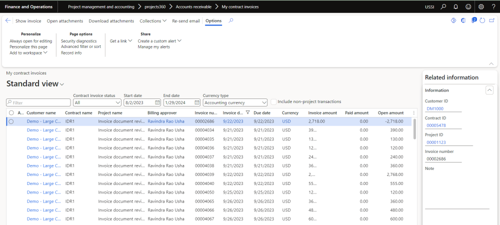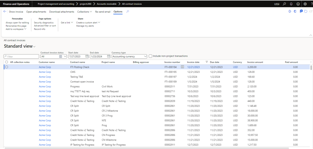 Go to Project management and accounting > projects360 > Accounts receivable > All contract invoices.