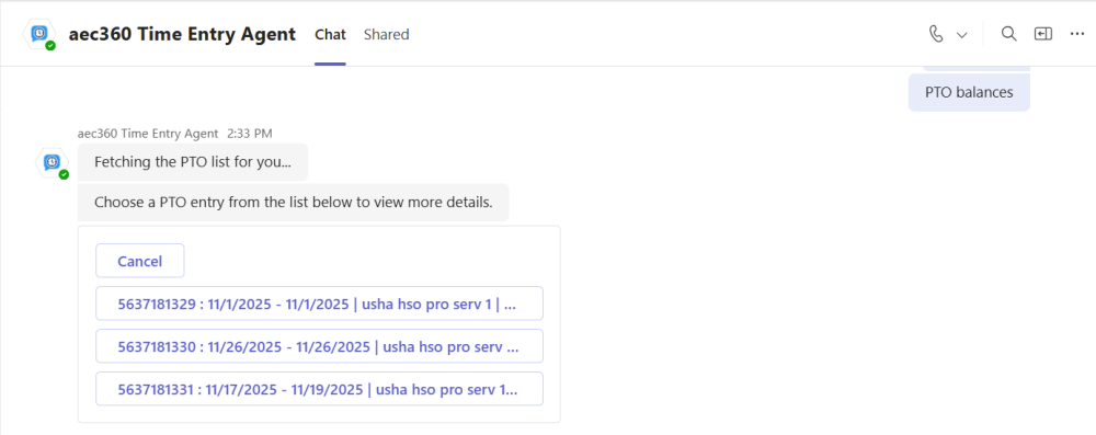 Users can ask the agent to display their personal time-off (PTO) requests. The agent retrieves all PTO requests and presents them in a list. From there, users can select a specific request to view its details.