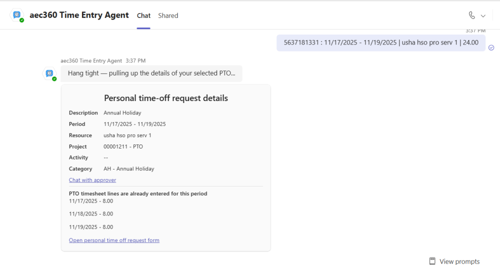 Select a PTO request to view its details. The agent displays information such as the PTO period, project category, and whether timesheet lines have already been entered for that period. From there, you can chat with the approver or open the personal time-off request form for further actions.