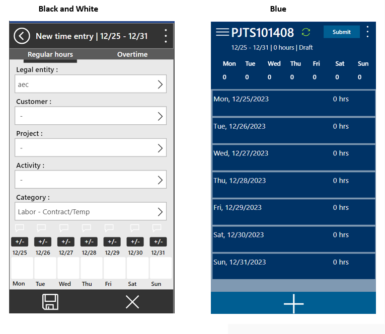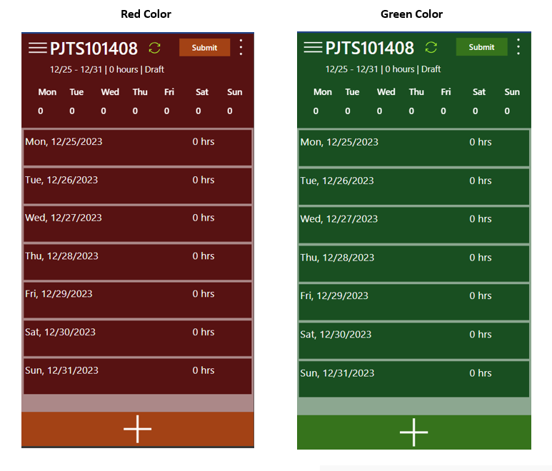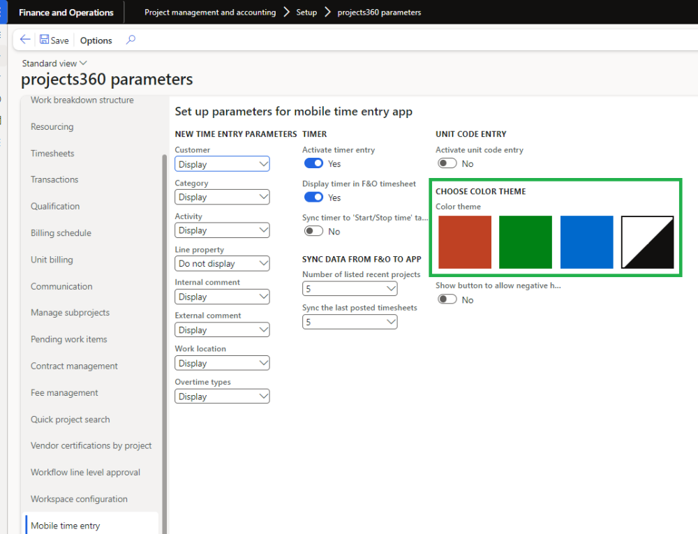 In the projects360 parameters form, within the Mobile time entry tab, system administrator can choose the company’s color scheme. Once selected, the timesheet app will be displayed in the chosen color scheme. If the app is open when this configuration change is made, the user will need to refresh the app or close and reopen it for the color scheme to take effect.