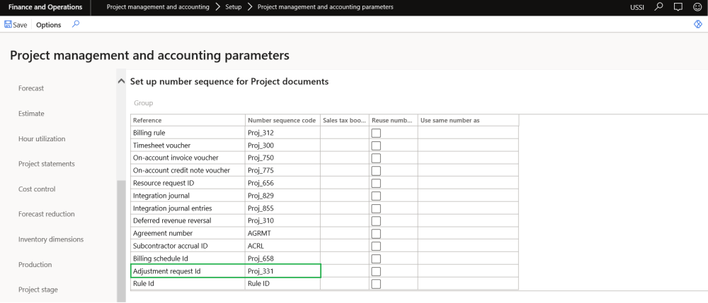 To generate the adjustment request, number sequence has to be set up in the project management and accounting parameters form.