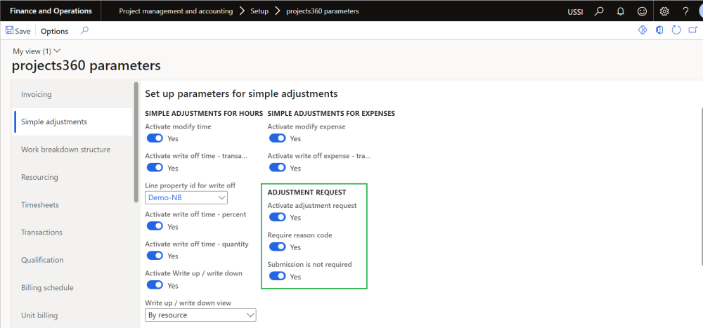 On projects360 parameter form, under Simple adjustment tab, a new parameters under “Adjustment request” has been introduced to control the creation of adjustment request. User needs to set the ‘Activate adjustment request’ field value to ‘Yes’ in order to use this feature.