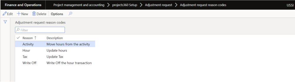 Go to Project management and accounting > projects360 setups > Adjustment request > Adjustment request reason codes.