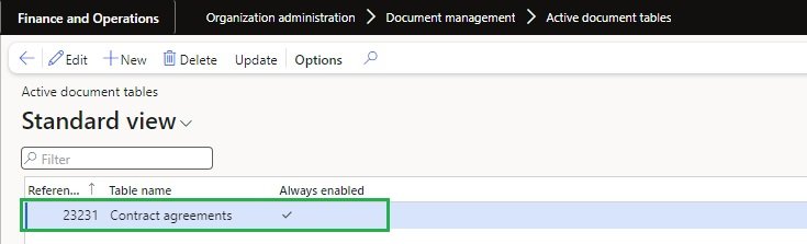 User need to configure the settings in the active documents tables form. The user will need to create a new record, specifying the table name as ‘Contract agreements’ and selecting the ‘Always enabled’ checkbox.