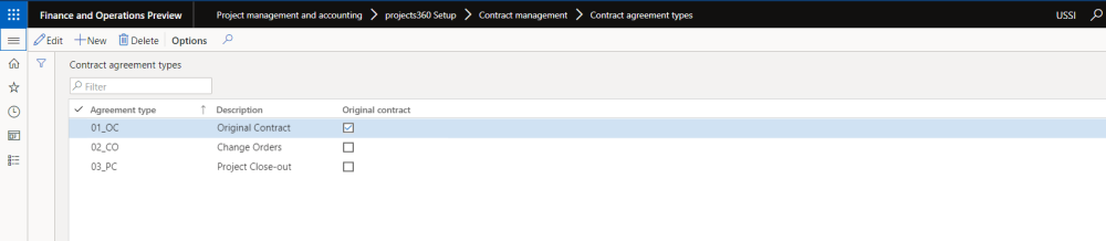 Go to Project management and accounting > projects360 Setup > Contract management > Contract agreement types