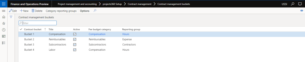 Go to Project management and accounting > projects360 Setup > Contract management > Contract management buckets