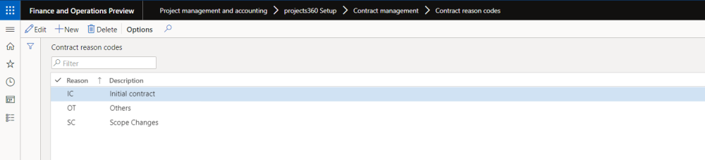Go to Project management and accounting > projects360 Setup > Contract management > Contract reason codes