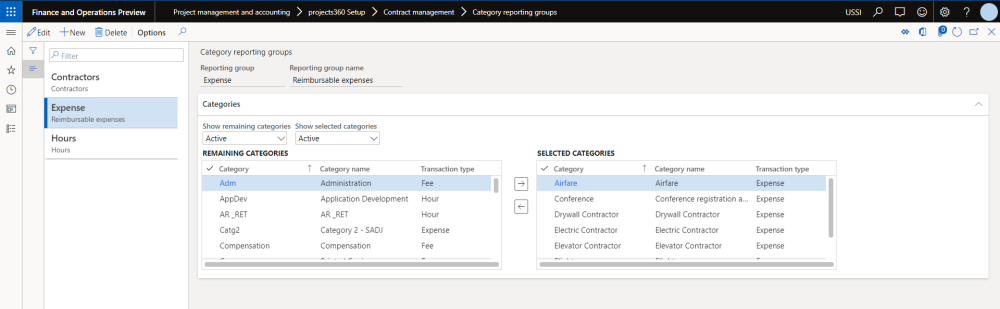 Go to Project management and accounting > projects360 Setup > Contract management > Category reporting groups