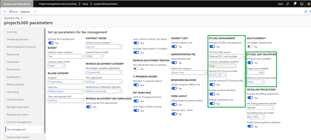 Go to Project management and accounting > All projects > Project contracts > Fee management tab > ETC/EAC management settings