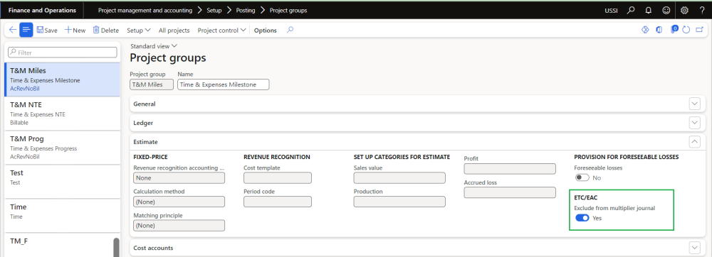 On project group form, under Estimate tab, new field ‘Exclude from multiplier journal’ is added at the project group level, which is subsequently inherited by all new projects created under this project group. This provides users with greater control over the implementation of the multiplier journals functionality, allowing them to specify project groups where this feature should or should not be applied.