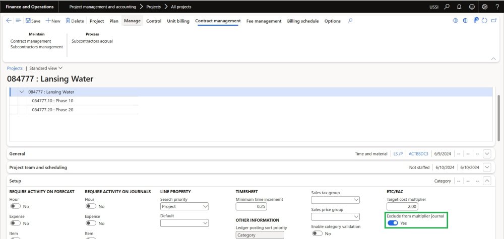 On project form, under Setup tab, new field ‘Exclude from multiplier journal’ is added at the project level. This field is applied at the project level and can be inherited by all subprojects within the same project hierarchy. This provides users greater flexibility in managing the multiplier journals functionality, allowing them to determine which projects or subprojects should include or exclude this feature.