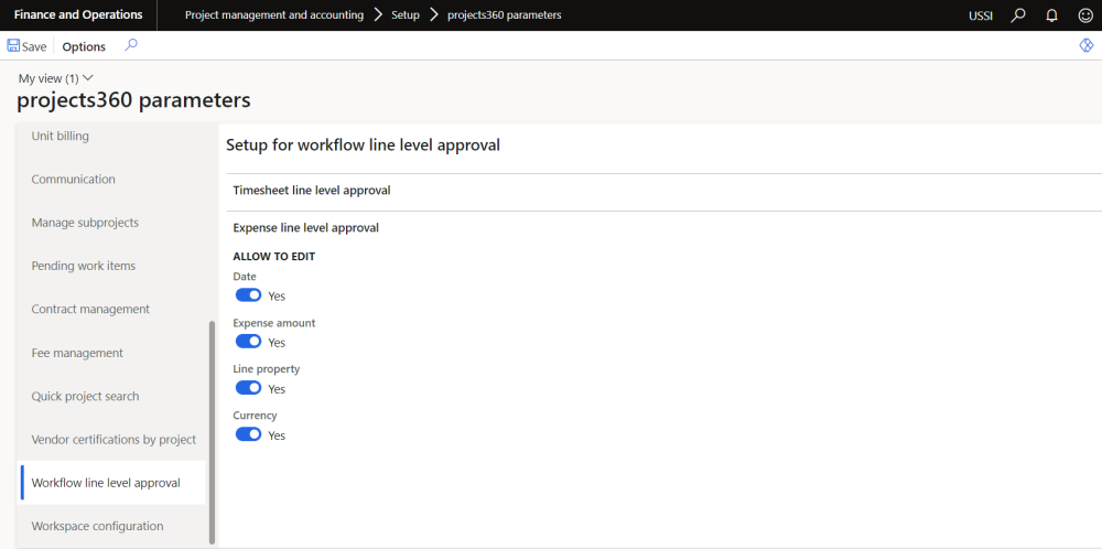 On projects360 parameter form, under Workflow line level approval tab, a new set of parameters under the “Expense line level approval” has been introduced to allow edit of few fields on Expense line level approval form. User needs to set the field value to ‘Yes’ in order to edit particular fields accordingly.