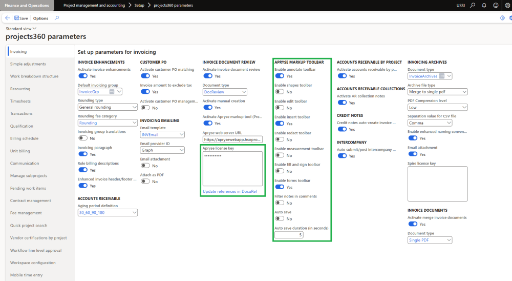 On projects360 parameter form, under Invoicing tab, a new parameter “Activate Apryse markup tool” has been introduced to manage Invoice document review in PDF format. These capabilities enable users to make the required changes directly on the PDF invoice, ensuring accuracy and reducing the need for manual adjustments. User needs to set the ‘Activate Apryse markup tool’ field value to ‘Yes’ in order to use this feature and define the related fields.