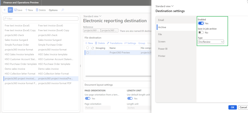 On the electronic reporting destination setting setup form, select a destination as Archive and attach Type to automatically attach the Invoice document to the Invoice proposal for the review.