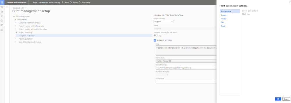 On the project print management setup form, select a destination to automatically attach the Invoice document to the Invoice proposal for the review. Here user can select any options except for the ‘Screen’ and invoice document review will work. If the user has set this option to ‘Screen’, the message pops during the invoice proposal submission but invoice document review do not get attached/created due to technical limitations. If the option selected is ‘Print archive’, make sure the ‘Save in print archive?’ is set to yes.