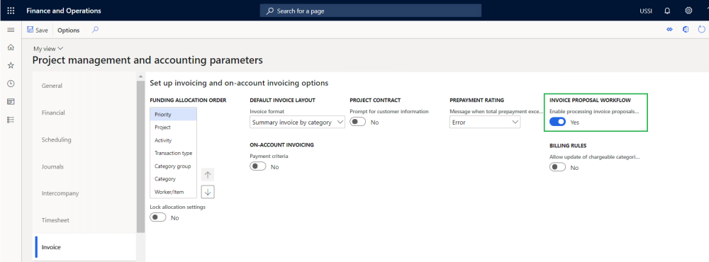 On project management and accounting parameter form, under Invoice tab, user needs to set the ‘Enable processing invoice proposal workflow’ field value to ‘Yes’ and workflow has to be setup for project invoice proposals in order to use this feature.