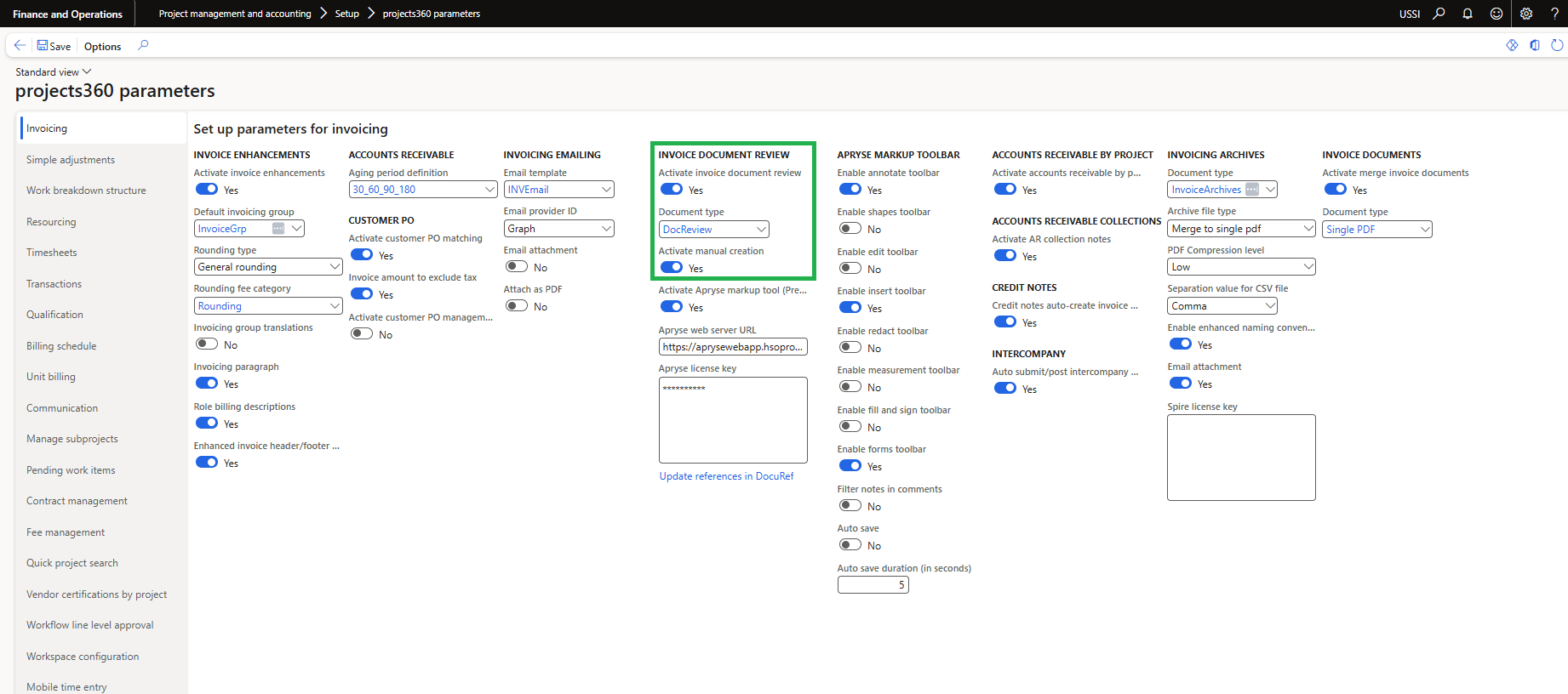 On projects360 parameter form, under Invoicing tab, a new parameter “Invoice document review” has been introduced to control the reviewing of the invoices. User needs to set the ‘activate invoice document review’ field value to ‘Yes’ in order to use this feature and configure the document type to be used for Invoice document review.