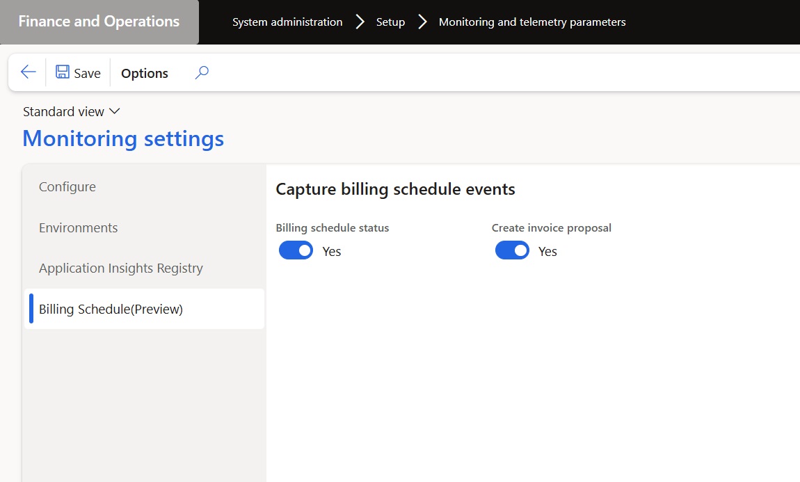 | Create invoice proposal | Enabling this parameter will track the events of creation on of invoice proposal through billing schedule. |