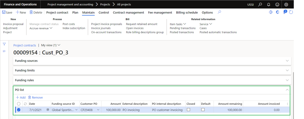 Customer PO can be created in the PO List Fast Tab that has been added newly for this feature in the Project contract form. The user can add as many Customer PO lines as required per funding source. However, per funding source only one PO can be set as default, for the PO to default onto the invoice. Once there is an approved Invoice proposal attached to a Customer PO line, then the Customer PO record cannot be deleted.