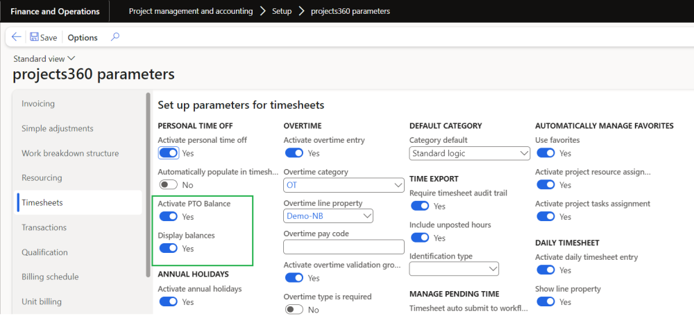 In the projects360 parameters, under the Timesheets tab ‘Activate PTO balance’ checkbox is available to control this feature.