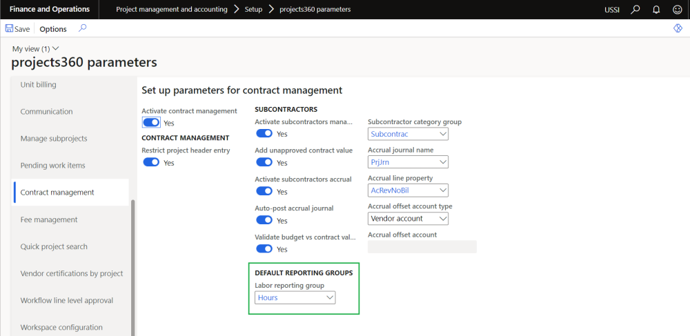 A new field ‘Labor reporting group’ is added on contract management tab of projects360 parameters. Values in ‘Total contract hours’ and ‘Total labor contract value’ fields will be displayed based on the labor reporting group defined on the projects360 parameters form.