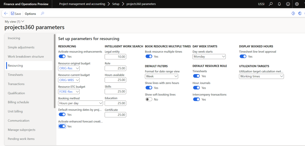 There is a separate parameter form to set the setup for projects360 resourcing. This form can be accessed from following path: