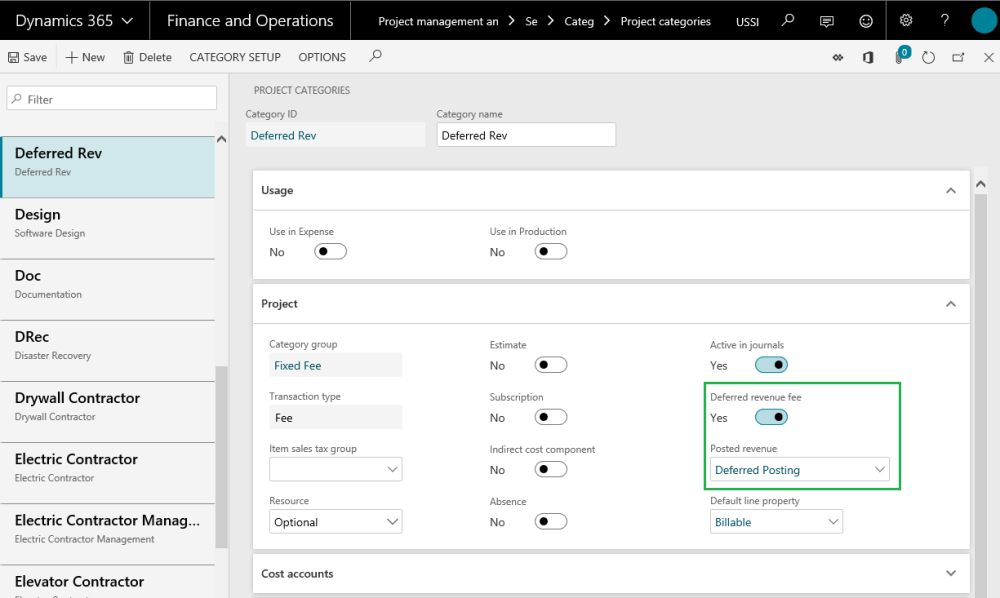 On the Project categories form choose a fee category to set it as a deferred revenue category. Mark the option Deferred revenue fee to ‘Yes’. Note the the deferred revenue fee checkbox will be available for only fee type of category group and not to the hour, expense and item type of category groups. Once this option is set to ‘Yes’, the Posted revenue field is enabled and becomes a mandatory field. This field will allow the users to select another fee category which will be used to actual booking of revenue upon the deferment posting.