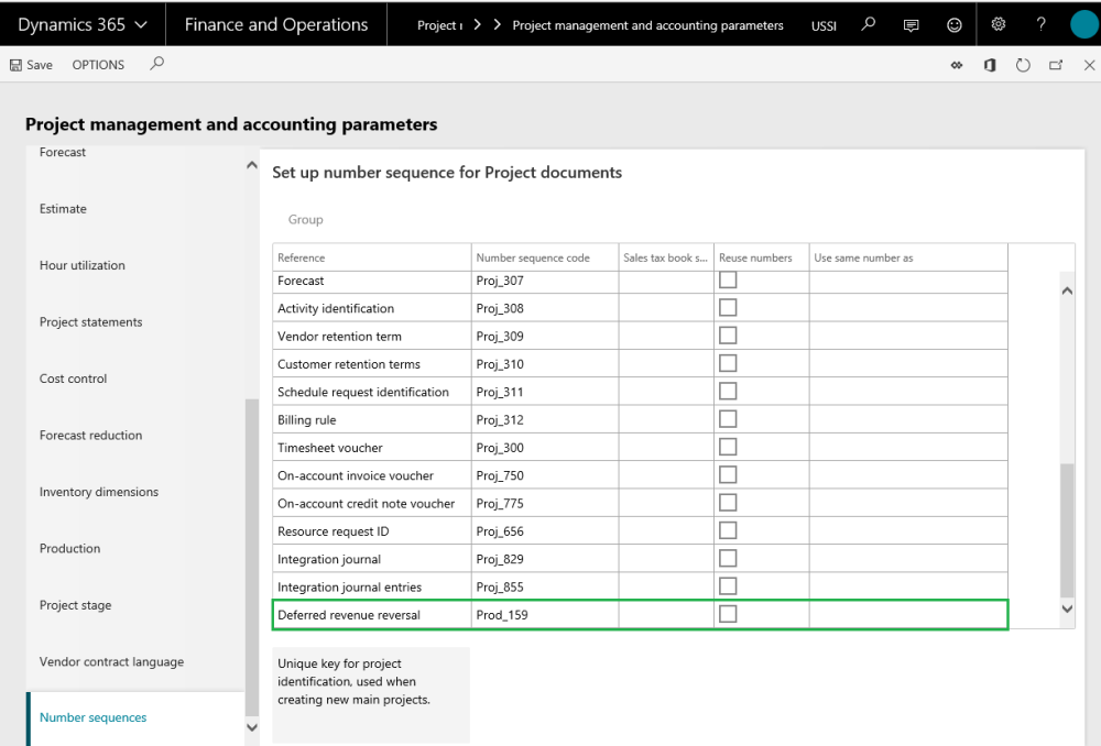 Revenue recognition reversal reference is added to the project management number sequence as soon as the user activates the Deferred revenue – Activate deferred revenue fee. Select the number sequence code for the reference – Deferred revenue reversal.