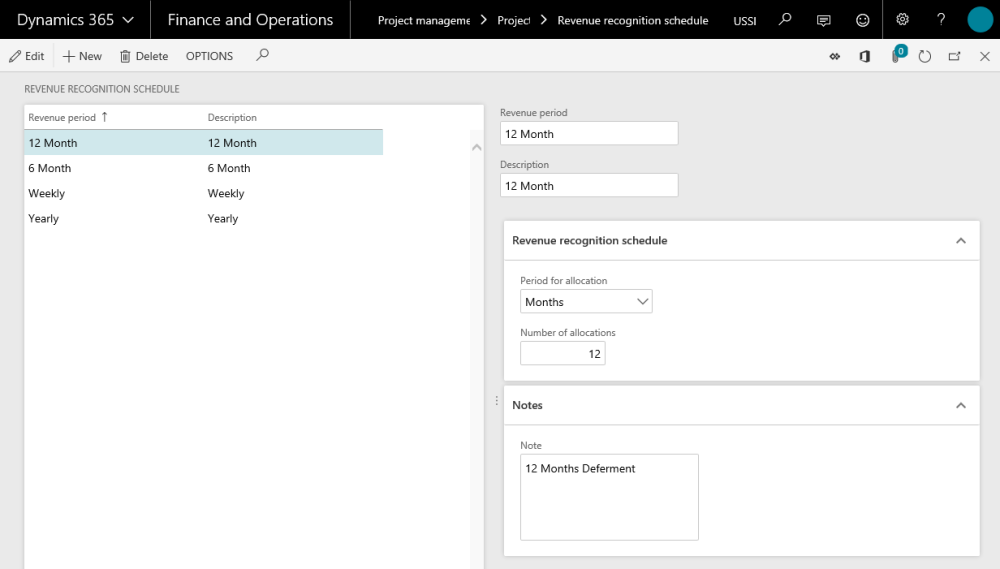 Go to Project management and accounting > Setups > projects360 Setup > Revenue recognition schedule