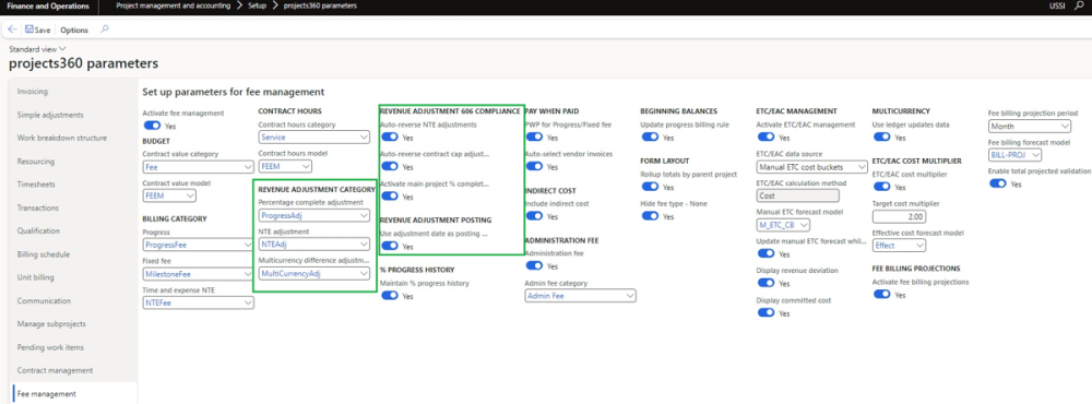 On projects360 parameter form, within the Fee management tab, few new parameters “Percentage complete adjustment” and “NTE adjustment” has been introduced. This fields allows us to configure the categories to be used while creating/generating the revenue adjustment records. User needs to set the “Activate fee management” field value to ‘Yes’ in order to use this feature. Along with activation, there are few more details need to filled in to use this feature, details of each field is provided in the table below the following visual.