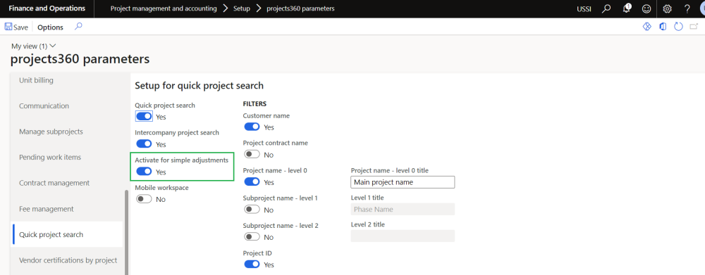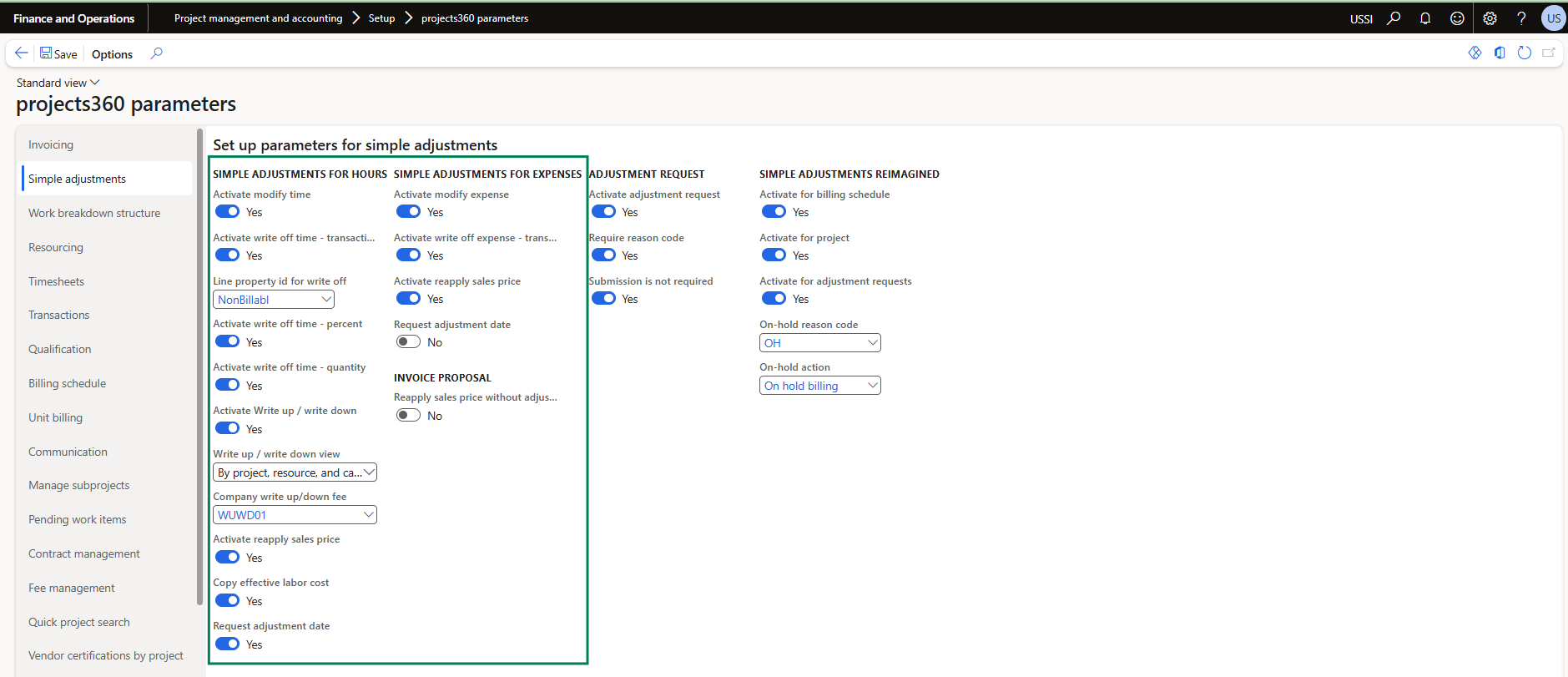 On projects360 parameter form, under Simple adjustment tab, a new set of parameters has been introduced to control the adjustments on the transactions and invoice proposal. User needs to set the field value to ‘Yes’ in order to use the different functionalities provided.