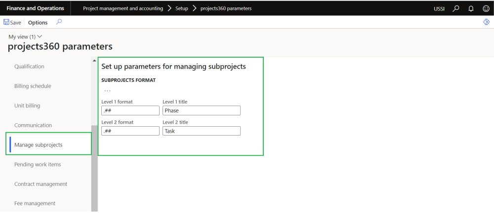 | Level 1 format | This field represents the format of subproject at level 1. This field is same as the standard field ‘Default subproject ID format’ on the project accounting and management parameters. Modifying the field on either places will reflect changes on the subsequent forms. |