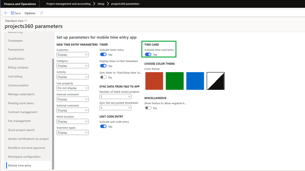 Go to Project management and accounting > Setup > projects360 parameters > Mobile time entry